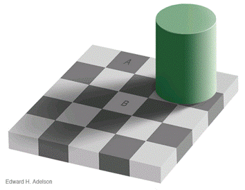After playing with this for God-knows-how-long, it reminded me of those famous optical illusions wherein a single color appears to be brighter or darker depending on the colors around it. After several more minutes of online searching, I found this website, which features Edward Adelson’s famous iconic example of the Checkboard Illusion — namely, that squares A and B below are the same color — together an explanation of the illusion; click the illusion to get proof!
