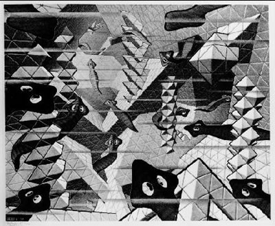 That got me to wondering about what other Escher ideas could be rendered in reality. Another few minutes of searching, and I ended up at this site, based on Escher’s Flatworms. This, shown below, depicts a realistic (though largely impractical) three-dimensional chamber built out of tetrahedral bricks. Click on the work to see how these blocks could be practically engineered in the real world.