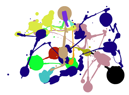 But then that got me surfing the archives linked at the top of the page, which consists of “fresh zero-content for compulsive clickers,” with the hidden caveat that most of the non-content contains some element of mathematical or computer science interest. This got me to thinking about other, more aesthetically-aimed (i.e. less obviously mathematical) zero-content applications for clicking away. After several more minutes of online searching, I found this website, which uses your mouse to create Jackson-Pollack-style digital paintings. Here is one example of my Pollackized mousery; click on it to give it a shot yourself: