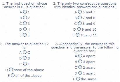 This got me to thinking about the topic of self-reference (a topic we’ve seen here before), and I got to wondering about other completely stand-alone examples of self-reference and, in particular, examples that wouldn’t need a math degree to appreciate. After a few more minutes of online searching, I found this web site, which gives a completely self-referential 20-question multiple-choice exam with a unique solution. In case you’re wondering what the hell such a test could possibly look like, here’s a sample of the questions; click on them to take the test.