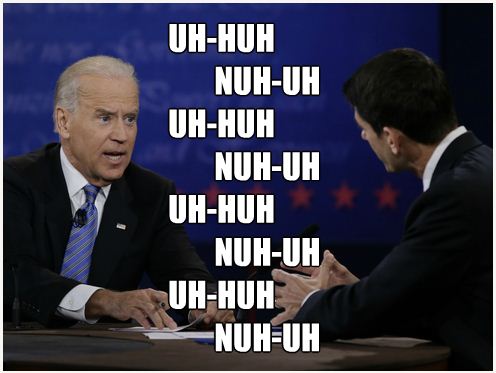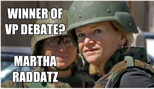Martha Raddatz: Welcome to the Vice Presidential debate. I’m your host, Martha Raddatz, and I’ve spent most of my life reporting the news from war-ravaged hellholes like Iraq and Afghanistan, and I’ll damned if I’m gonna get walked all over like Leher last week. Biden, Ryan, front and center!